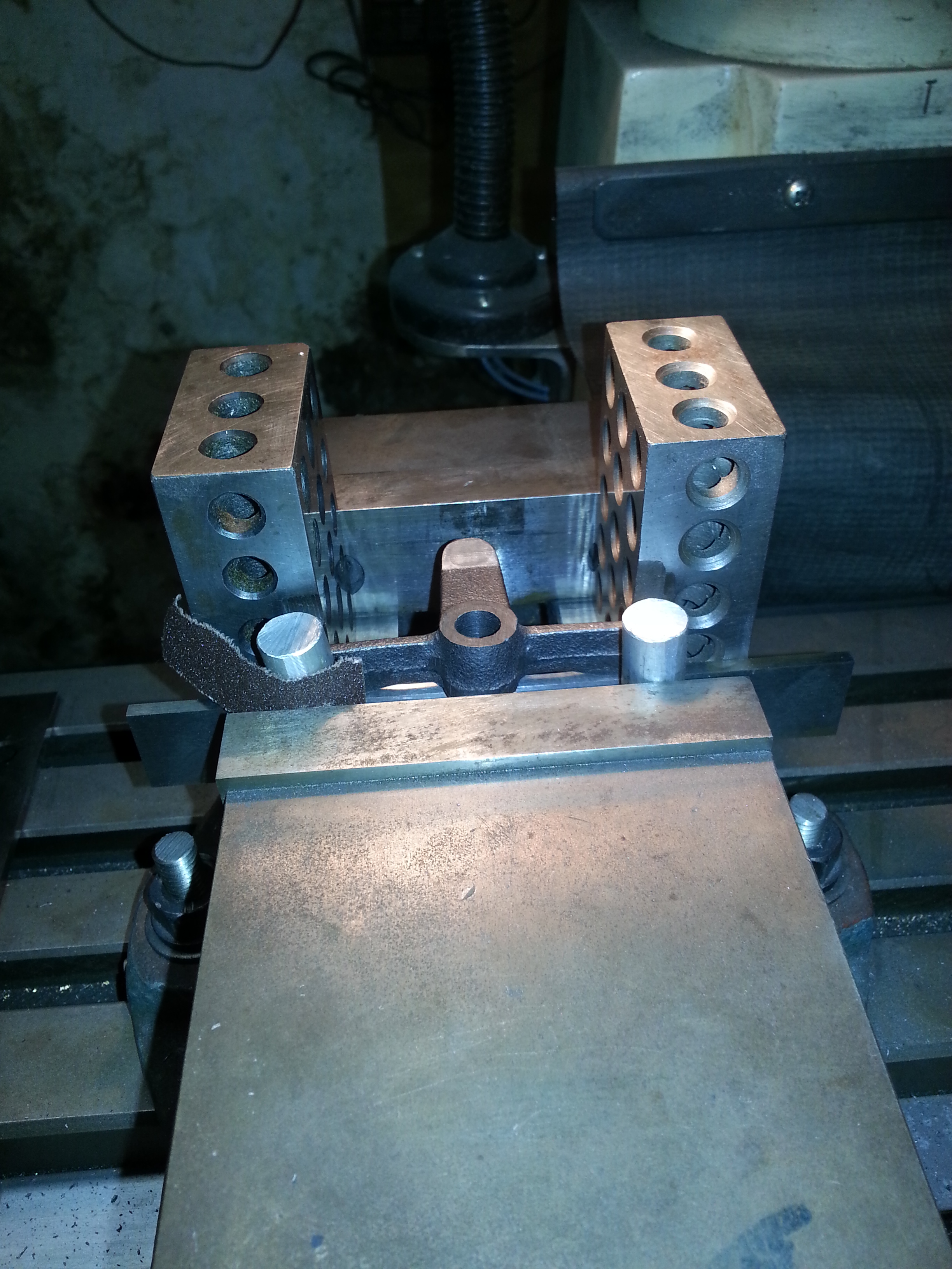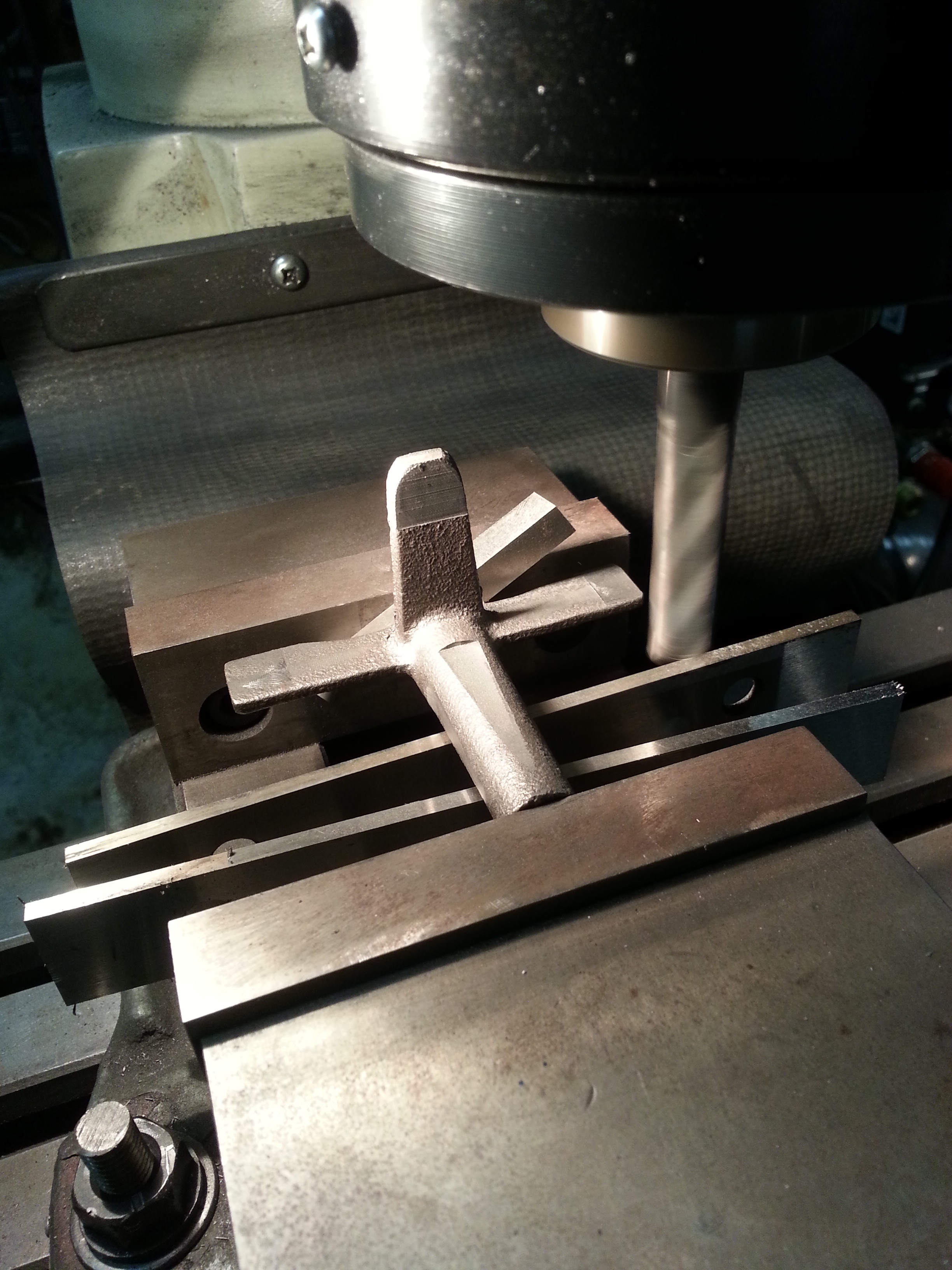 For the spark rocker I needed some place to start. I filed the casting numbers down until they were at the same plane as the outboard arms. Then I set it up in the mill eyeballing everything level. This give me a starting point. I milled 3 flats on the shaft for the lathe's 4 jaw chuck. I flipped it over and milled a fourth flat. Size doesn't mean anything it's just flat surfaces to hold. I set it up in the lathe and indicated to the round part. It's a casting so it's not going to be that critical it's a starting point. I then took a skim cut across the arms then faced the inside to length, then drilled and reamed it. Just for kicks I also turned the outside of the arms so they are centered and square. In the 3rd pic I set a parallel on the faced section to square it that way and eyeballed the arms level. This gave me the hold I needed to mill the pads for the 3/16 hole. I also took skim cuts at the ends of the arms to establish the same arms level later. I wasn't sure if I would need it but I'm VERY glad I did. The 4th and 5th pics are having the part clamped using those flats and the face cut I made on the arms when I had it in the lathe. Another example of taking an opportunity to make a location cut any time you can since you never know when you'll need it! The last pic is again using those flats cut earlier to rest it on parallels to cut the recess and drill the holes.