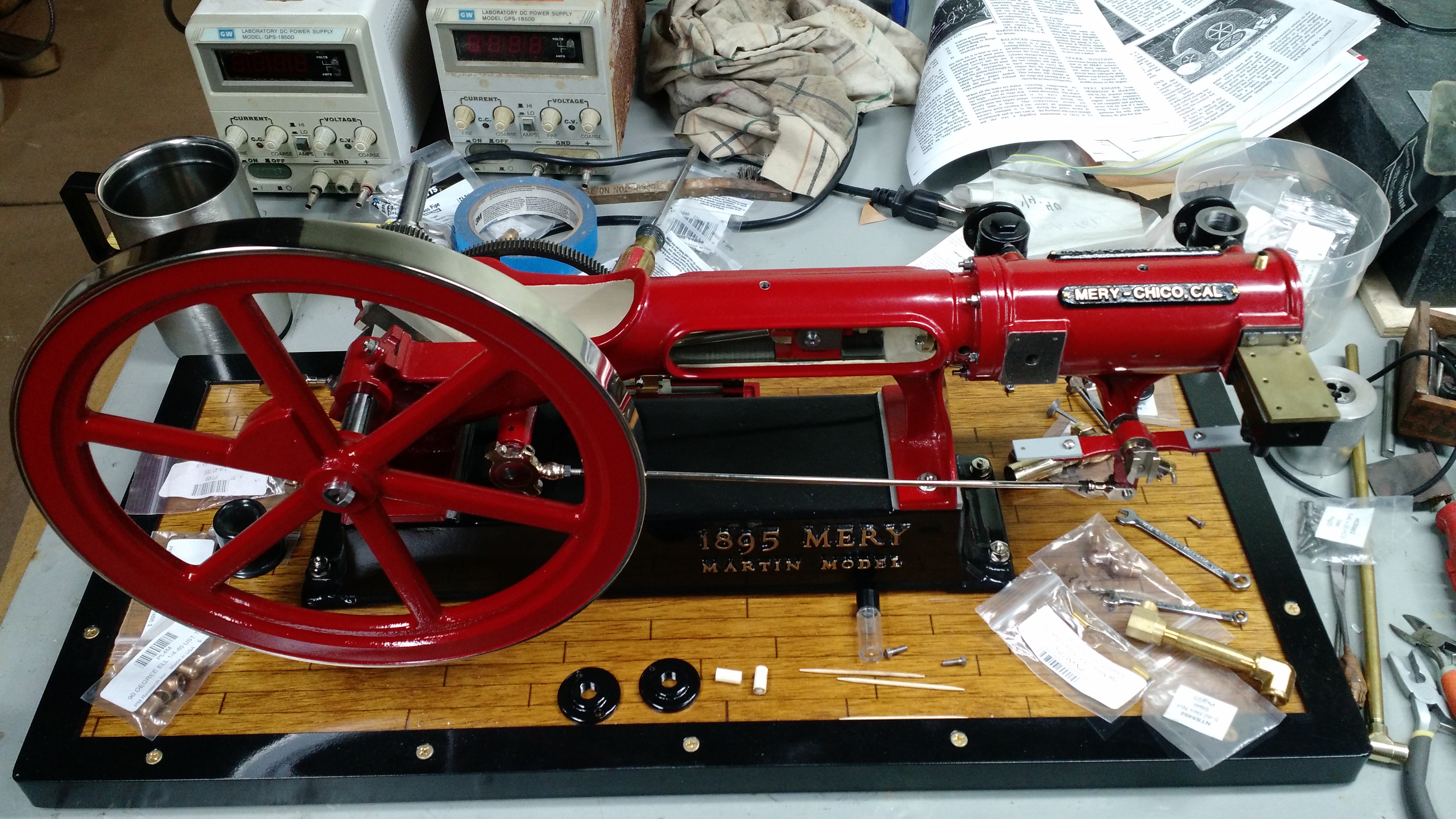 It's been a while since I posted any updates. I spent the past winter doing the finish polishing, plating and painting. I actually ended up painting several parts a few times. I painted the main body and a few other parts with color then clear using Krylon. The clear was so brittle that as soon as I tightened a nut against it, the clear shattered like glass. So I striped and repainted with Rustoleum. That paint is much less brittle. I also plated most of the hardware with nickel plate. I didn't get all of the parts done so I'll have to setup the plating tanks again. The photos here are with a lot of the parts assembled. The picture on the rigth end has the cooling pump. I tried to build a centrifugal pump but to build one to a reasonable scale just didn't work to move water. I resorted to a positive displacement pump instead. It's my own design and hopefully works. It's belt driven by a large O-ring from the main shaft.